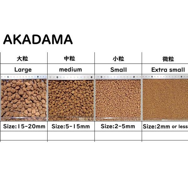 - Đất Akadama là loại đất sét đỏ có nguồn gốc là đất tro núi lửa, được sấy khô có dạng hạt sau khi được sàng ra từ bột và từ đó được tách ra riêng biệt theo từng kích cỡ lớn, vừa và nhỏ tùy theo mục đích sử dụng